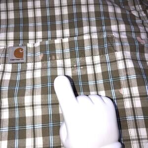 This Carhartt plaid button down shirt is labeled the "relaxed fit" style. It is olive green, white and a very very little blue. It has one chest pocket with the logo and it is short sleeve.