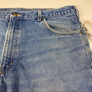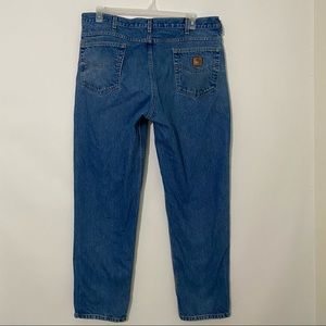 Carhartt relaxed fit blue jeans size 40X32 great work jeans casual pre owned these jeans do have some light stains and wear no holes or rips There is a few loose threads at the bottom of the zipper no holes ( I took a close up of this)