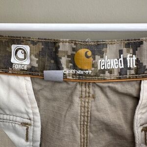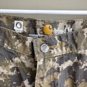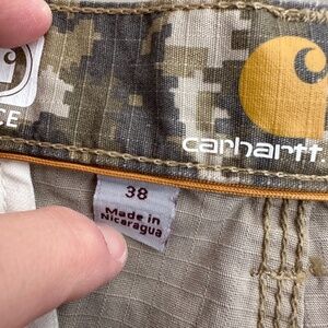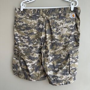 Men's Carhartt relaxed fit cargo shorts. Digital Camo style. 100% Cotton. In nice shape, freshly washed. Velcro pockets, zipper on right side pocket. Size 38