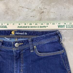 Durable and comfortable Carhartt Relaxed Fit Women’s Jeans in dark indigo blue denim. Made to handle work or everyday wear with quality stitching and a flattering bootcut silhouette.