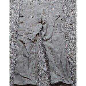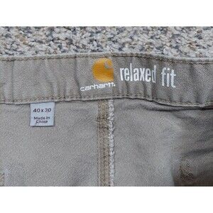 The Carhartt Relaxed Fit Rugged Flex Carpenter Pants in men's size 40x30 are designed for durability and comfort. Made of a blend of spandex and cotton in a beige color, these pants feature a zip fly with a button closure and a 5-pocket design for practicality. With a flat front and straight leg style, they are ideal for workwear or casual occasions. The high-rise fit and relaxed style provide ease of movement, making them suitable for travel or everyday wear. These machine washable pants from the Carhartt Rugged Flex line offer both functionality and style.