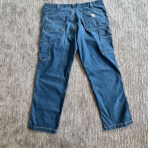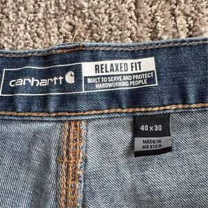 Keywords: Carhartt, men's jeans, relaxed fit, utility jeans, blue denim, rugged flex, 40x30, straight style, workwear, cotton blend, machine washable, deep pockets, pre-owned, carpenter, work, cargo, rugged