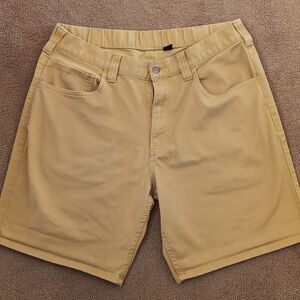 Carhartt shorts in warm sand. Five pocket style. Signature patch and hardware. Just a little elastic at waist in back. 34-36 at waist. 11.5 inch rise. 9 inch inseam. Classic.