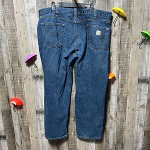 Details: back patch pocket, straight leg, relaxed fit, dark wash, some stretch
