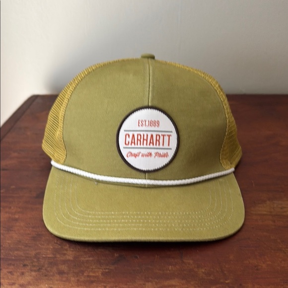 Carhartt trucker cap in mustard yellow. Features white rope detail and logo patch.