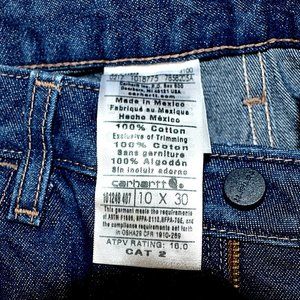 Carhartt FR label sewn on back pocket; NFPA 2112/CAT 2 label sewn on waistband