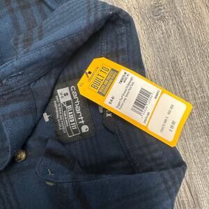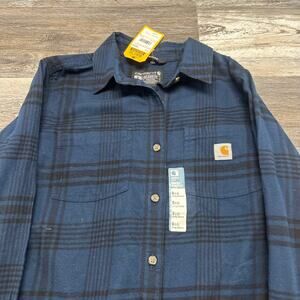 NWT Carhartt Rugged Flex Flannel NEW Plaid Blue Black Tan Women's Size Small Relaxed Fit Midweight Tunic Shirt Long Sleeve button up curved hem chest pockets patched spell out logo collared buttoned cuffs cotton elastane stretchy lightweight classic casual tunic shirt made in India