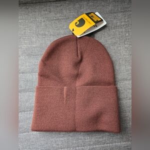 Classic Carhartt beanie in a warm rust color. Features iconic logo patch. Ideal for cold weather.