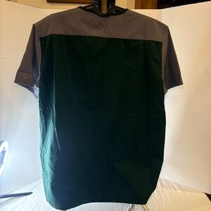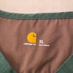 The Carhartt Scrub Top in Men's XL size is a green color shirt with gray short sleeves designed specifically for the medical industry. Made from a blend of cotton and polyester, this top features a convenient medical pen pocket tech shirt design. With a focus on functionality and durability, this shirt is ideal for healthcare professionals looking for comfortable and practical work clothing. Made in Vietnam, this top showcases Carhartt's quality assurance and attention to detail in creating reliable workwear for men in the medical field.
