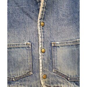 Vintage 1980s Western jean vest with snap closure and cozy sherpa lining. Rugged denim look with warm interior, perfect for layering in colder seasons. Classic Carhartt quality with timeless Western style.