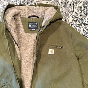 I have tragically outgrown my Carhartt. It’s in great shape, and ready for a new home. I always get compliments every time I wear this jacket. It’s rugged and practical, while still being cute. Fantastic green color and warm Sherpa lining with cuffed sleeves to keep the cold out. Has worked well for me in the fall chill as well as surprise snow days.