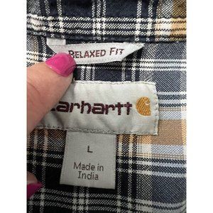 Carhartt Shirt Men's Large Button-Up Short Sleeve Cotton Casual Plaid. In good Preowned Condition with no obvious flaws holes or stains. Shows some signs of light wash wear or use. I appreciate your business and strive for a five star rating. Please feel free to message me with questions.