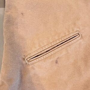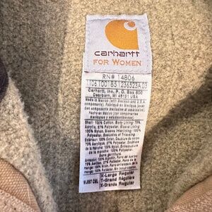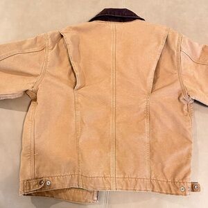 Stylish Carhartt utility jacket. Features a tan body with a contrasting brown collar. Durable and versatile design. Fits more like a large