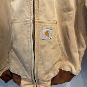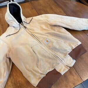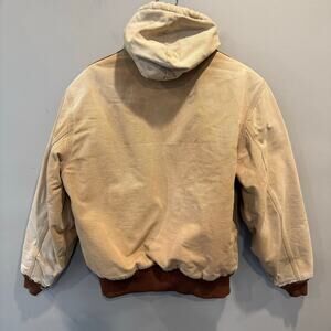 Features: lined in quilted flannel; duck canvas, drawcord hood, front pockets, Carhartt patch, ribbed cuffs and hem; hooded
