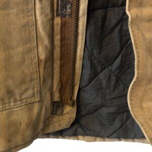 Well worn ripped faded and torn Carhartt insulated work jacket offers warmth with its quilted lining, making it suitable for labor-intensive tasks in cold environments.