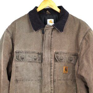 The Carhartt 90's Vintage Chocolate Brown C26 CHT Duck Canvas Corduroy Collar Quilt Lined Jacket in size LT is a vintage workwear piece perfect for winter, fall, and spring seasons. Made with cotton canvas outer shell material and insulated with polyester, this short-length overcoat features a zip and hook & loop closure, lined with nylon, and has multiple pockets for added convenience. With a classic distressed look and American-themed accents, this jacket is ideal for walking, hunting, and hiking activities, and is part of the Carhartt product line. SELLING AS-IS