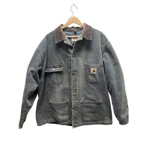 This Carhartt Vintage 90's Gray Distressed Canvas Chore Barn Coat embodies timeless style and rugged durability. Perfect for work or casual wear, it offers warmth and comfort in a classic design. Flannel blanket lining, corduroy collar... Perfectly worn and distressed! Some small paint marks, fading, and inside is pilling.