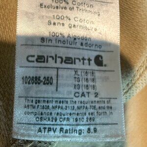 Carhartt FR label sewn on pocket; NFPA 2112/CAT 2 label sewn on front