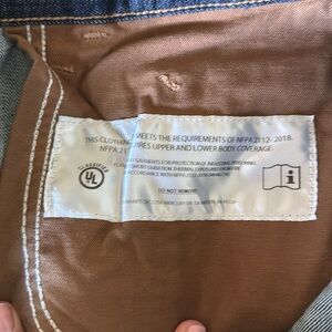 These FR jeans have just the right amount of stretch and room to move during the workday. 11-Ounce, FR denim: 69 percent cotton/30 percent mod acrylic/1 percent elastane • original fit • built with rugged flex to bend and stretch with you as you move • mid front rise; sits just below the waist • higher back rise for added coverage • comfortable fit through hip and thigh • garment washed for soft finish • arc-resistant button closure at waist • brass zipper fly with Nomex FR zipper tape • two reinforced back pockets • leg openings fit over boots • Carhartt FR label sewn on back pocket; NFPA 2112/cat 2 label sewn on waistband • meets the performance requirements of NFPA 70E and is UL Classified to NFPA 2112