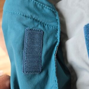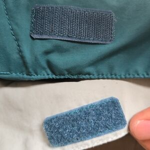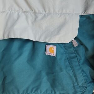 Stylish Carhartt jacket in teal and gray. Features iconic logo patch.