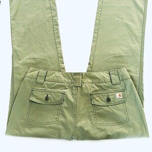 Carhartt Women’s Relaxed Fit Trail Pants, Size 12/34 (See approximate measurements in photos), Khaki Green. 2 side pockets on front. 2 flap pockets on back. Large belt loops. Very Good Condition. 720