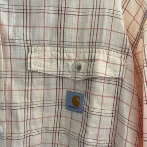 This soft lightweight plaid button up collared tunic top is by Carhartt. It has a Loose Fit style fitting oversized. This long sleeve tunic features side pockets and is a women’s size Large. Fantastic condition!