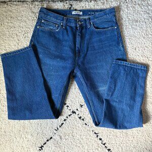Carhartt Work in Progress women's jeans. High waist, slim, tapered. All cotton, no stretch. A couple of small white marks, but otherwise in excellent preowned condition. No size tag, but they are approximately a size 29 (check measurements). Flat, they measure 16 inches at the waist, 19 inches at the hip, the rise is 10 inches, and the inseam is 26 inches.