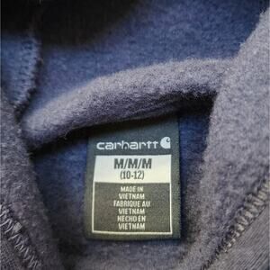 Carhartt Youth Long Sleeve Navy Graphic Hoodie, size M (10-12), navy blue with white logos, front kangaroo pocket, fleece lined, very good condition.
