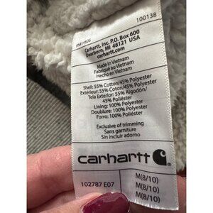 Stay warm and comfortable with this Carhartt sherpa-lined full-zip hoodie in a heather gray color. This style is made for durability, warmth, and everyday wear. It features a soft and plush sherpa lining throughout the hood and body, a relaxed fit, front pockets, full zipper closure, and the signature Carhartt logo patch. Size is Youth M (8/10). Tag indicates Fall 2020 production.
