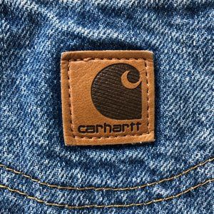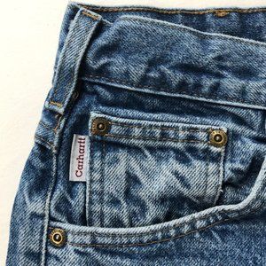 Carhartt men’s heavyweight denim jeans. Authentic farm-work wear. (Two small holes are from working with barbed wire fencing. See last photo) Leather-look logo back pocket patch. Seven belt loops. 17.75"W across waistband when laid flat. 32"L inseam. 12.75" from crotch seam to top of waistband at center front.