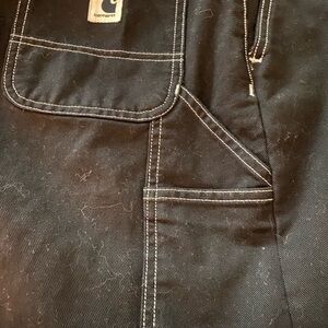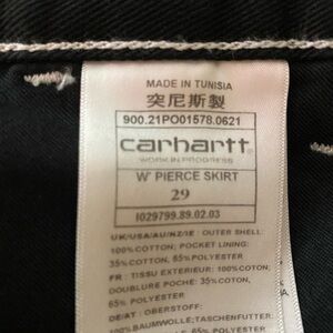 Carhartt black denim skirt, high waist, raw hem. 4 pockets plus 2 on the side.