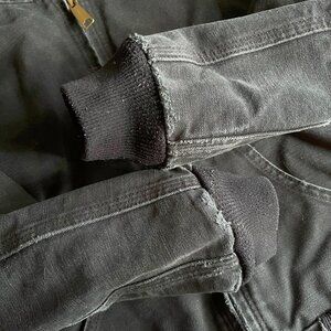 Carhartt vintage black canvas hooded jacket with charcoal gray fleece lining. Kids' size 8. Style is YYJ158 BLK. GUC; some all-over fading and a few spots of wear, including noticeable wear and a small hole at the cuffs (see photos).