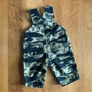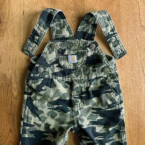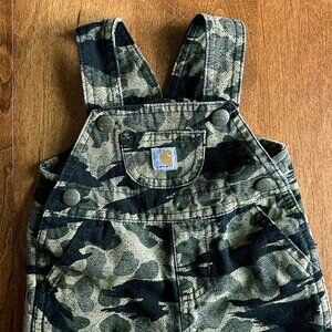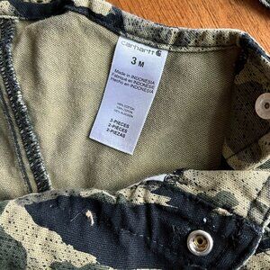 Carhartt bib overalls in olive green and black camo print, baby size 3 months. Adorable tiny style with logo patch on the front pocket, two snaps on each shoulder strap for adjustable sizing, and snaps up the legs for easy changing. VGUC; slight wash wear.