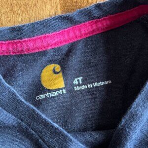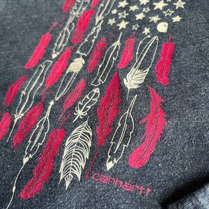 Carhartt long-sleeve navy blue graphic tee with magenta and white American flag design with feathers and stars. Size 4T. GUC; slight wash wear and minor fading at the elbows.