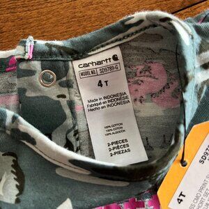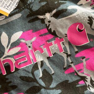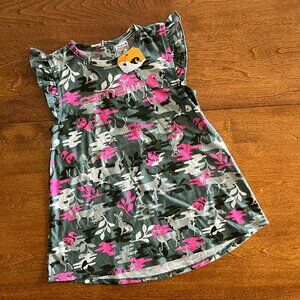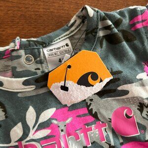 Carhartt jersey swing tunic top with flutter sleeves and pink brand lettering across the chest. Size 4T. Pattern is camo eucalyptus green with gray and pink accents that includes cute forest animals including deer, rabbits and squirrels. Three snaps up the back at the collar. This was originally sold as a two-piece set with shorts, and I do not have the shorts. The top is NWT, never used, though please note the actual tag is ripped and the top has minor rumpling from being packed with other clothing.