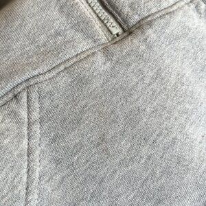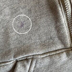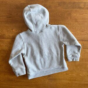 Carhartt heather gray hoodie sweatshirt in toddler size 3T. Half-zip pullover style with black logo on the chest and lettering down the sleeve. GUC; light but extensive staining on the front, with one small purple mark and light discoloration toward the bottom of the zipper, along the top of the pocket and a few spots on the front pocket. Fabric is in very good condition aside from the staining with only minor wash wear.