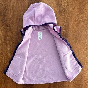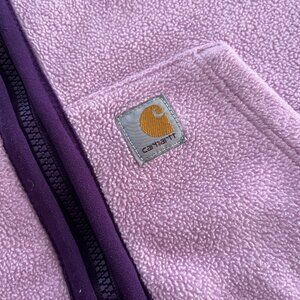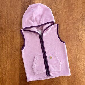 Carhartt hooded fleece vest with dark plum purple trim in size 4T. Color is light pink-purple lavender with dark plum purple trim. Cute zip-up style with logo patch on the front pocket. VGUC; slight wash wear.
