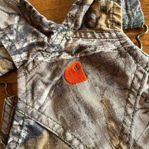Carhartt ripstop Realtree camo bib overalls shorts in baby size 6 months. Lightweight fabric great for warm weather. Adjustable buckle straps, and embroidered orange logo on the back. GUC; some all-over wash wear and minor fading.
