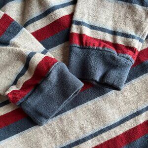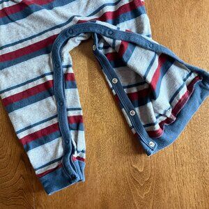Carhartt striped long-sleeve outfit in baby size 18 months. Cute one-piece outfit in soft 100% cotton jersey, in heather gray with navy blue and crimson red stripes. Two henley-style logo snaps at the collar, brand patch on the chest pocket, and snaps up the legs for easy changing. Super cute and comfortable go-to play outfit. VGUC; slight all-over wash wear.