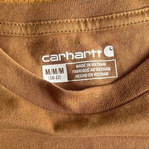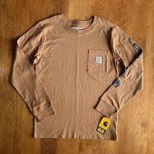 Carhartt long-sleeve pocket shirt in classic tan or brown color, kids' size Medium (10-12). NWT; slight rumpling from being packed with other clothing.