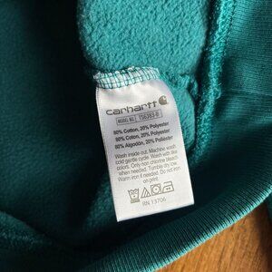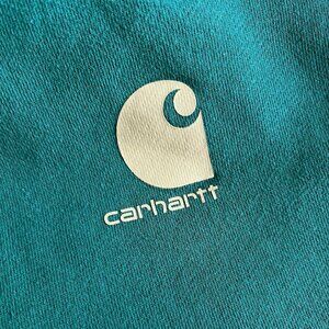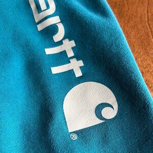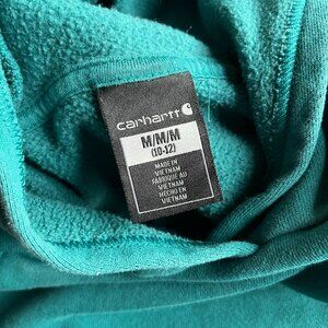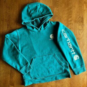 Carhartt teal green pullover hoodie sweatshirt in kids' size Medium (10-12). Rich green color with chest logo and lettering down the sleeve in pale green-yellow. GUC; one hole in the front kangaroo pocket, otherwise in great condition with very slight wash wear/fading at the seams.