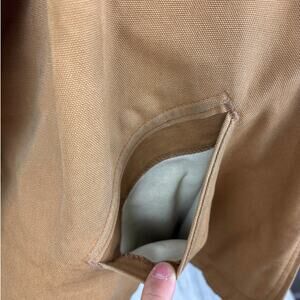 Description: brown duck canvas jacket, blue stripe blanket lined made in september of 1995. Corduroy collar, zip closure clean front pockets. one dirt mark on the back of the left arm, no tears or rips extremely difficult to find in this condition