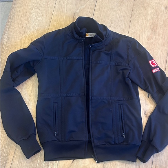 Classic Carhartt bomber jacket in navy. Features a zip front and side pockets. Comfortable and durable design.