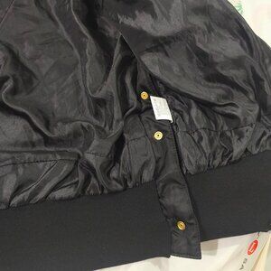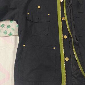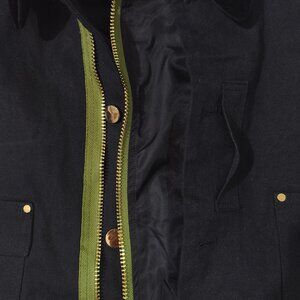 Black workwear style with a corduroy collar; the green zipper lining contrasts with the black lining, accented with gold metal zippers and buttons.