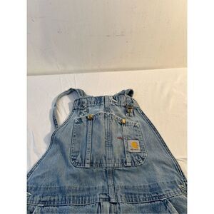 Carhartt overalls USA thrashed missing buckle rn#14806. measures 19" across the waist, 28" inseam. 100 cotton. 1 strap works.
