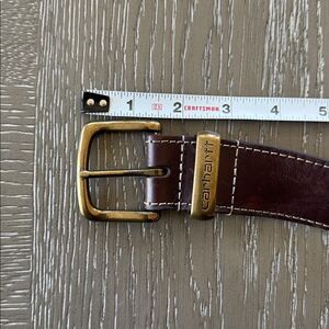 Dark brown leather belt with a sturdy bronze tone buckle. Features Carhartt branding.