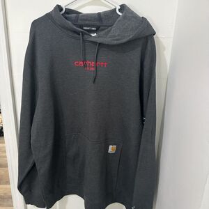 Classic Carhartt hoodie in dark gray. Features bold red logo. Comfortable and durable for everyday wear.size XL smoke free home