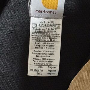 Keywords: Carhartt jacket, quilted jacket, men's outerwear, vintage style, workwear, streetwear, hooded jacket, brown jacket, 2XL jacket, ribbed cuffs, mid-length jacket, pre-owned jacket, canvas jacket.