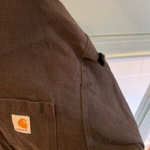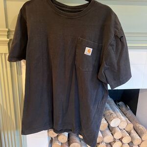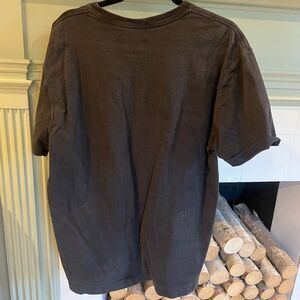 Faded black tee with front pocket. Simple and durable design. Small tear on shoulder.