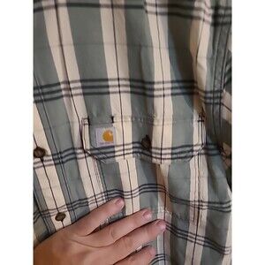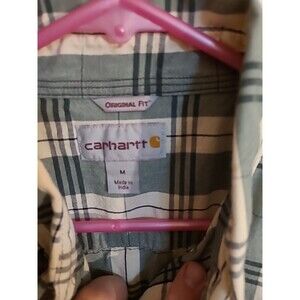 The shirt is made of comfortable cotton material and has a regular fit, with a spread collar and button closure. It also features convenient pockets and is machine washable for easy care. This shirt is part of the Carhart Original Fit product line and is available in size medium. It is a great choice for any man looking for a high-quality, all-season shirt. Look closely at the pictures for condition and measurements